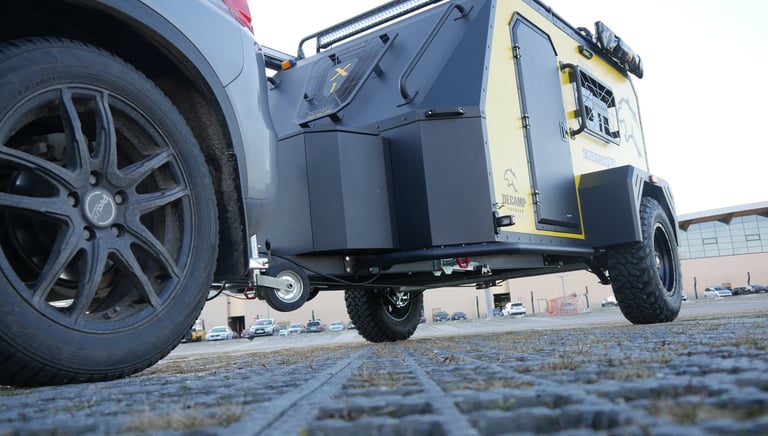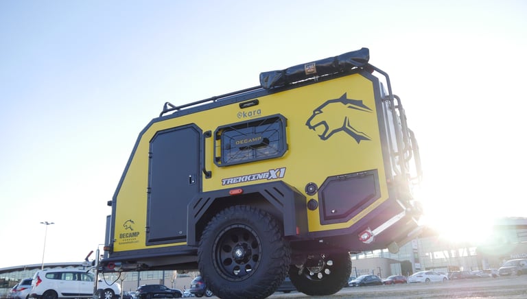The Decamp X1+ is designed for ultimate convenience and adventure. With a lightweight construction of just 625 kg, it is suitable for a standard Category B driving license and does not require a separate license plate. However, when fully equipped with accessories, it may exceed 750 kg, requiring its own registration. Built on a sturdy steel frame with a lightweight aluminum structure and protective coating, the Decamp X1+ ensures durability and longevity. Its well-insulated panels provide excellent temperature regulation, keeping you cool in summer and warm in winter. Inside, high-quality craftsmanship creates a comfortable and inviting atmosphere. Thanks to its low weight, it can be towed by almost any vehicle, and its compact size allows for easy maneuvering, even through narrow streets. For true off-road adventures, an optional chassis with independently suspended wheels is available.